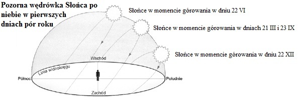 Oświetlenie Ziemi Cele:Uczeń: - wymienia astronomiczne i klimatogeniczne pory roku dla Polski; - zna i wykorzystuje do obliczeń wzory na wysokość Słońca nad horyzontem w momencie górowania; - potrafi narysować pozorny ruch Słońca wykorzystując układ horyzontalny; - wymienia elementy układu horyzontalnego; - zna strefy oświetlenia Ziemi i wymienia ich charakterystyczne cechy; - zna różnicę między kalendarzem juliańskim i gregoriańskim. Treści przedstawiane na lekcji: Oświetlenie Ziemi w poszczególnych dniach roku jest różne z uwagi na kąt nachylenia osi ziemskiej do orbity ziemskiej. Ten kąt wynosi 66034’. Ziemia zmienia więc ciągle swoje położenie w stosunku do Słońca i tym samym miejsca na niej są w zróżnicowany sposób ogrzewane. Biorąc pod uwagę górowanie Słońca w zenicie nad równikiem i zwrotnikami wyróżnia się cztery astronomiczne pory roku: wiosnę, lato, jesień i zimę. Gdy jednak podstawowym wyróżnikiem są średnie temperatury w danym miejscu w ciągu roku, to pory roku nazywa się termicznymi lub klimatogenicznymi. W Polsce według różnych klasyfikacji wyróżnia się 6 lub 7 pór roku: - wg Romera: przedwiośnie, wiosna, lato, jesień, przedzimie i zima; - wg Instytutu Meteorologii i Gospodarki Wodnej: przedwiośnie, wiosna, lato, polecie, jesień, przedzimie i zima. W różnych porach roku i miejscach na Ziemi, Słońce ma swój moment górowania na różnej wysokości. Łatwo można obliczyć tę wysokość w pierwszych dniach astronomicznych pór roku, wykorzystując zależność wysokości Słońca od szerokości geograficznej miejsca obserwacji. 21 III i 23 IX promienie słoneczne padają na równiku prostopadle do płaszczyzny horyzontu (Słońce góruje tam w zenicie). Są to dni równonocy - dzień trwa tak samo długo jak noc we wszystkich miejscach na Ziemi. 21 III na półkuli północnej rozpoczyna się astronomiczna wiosna, a 23 IX astronomiczna jesień. Poza kołem podbiegunowym północnym od 21 III do 23 IX występują dni polarne, a na półkuli południowej poza kołem podbiegunowym - noce polarne. Od 23 IX do 21 III sytuacja jest odwrotna - dni polarne występują w strefach podbiegunowych na półkuli południowej, a noce polarne na północy. W pierwszych dniach astronomicznej wiosny i jesieni szerokość geograficzna miejsca obserwacji jest odwrotnie proporcjonalna do wysokości Słońca nad horyzontem, dlatego wzór na obliczenie szerokości geograficznej jest prosty: φ = 900 – h 21 VI promienie słoneczne padają na zwrotniku Raka prostopadle do płaszczyzny horyzontu. Na półkuli północnej jest to najdłuższy dzień w roku - dzień przesilenia letniego. Data ta rozpoczyna astronomiczne lato na półkuli północnej. W pierwszym dniu astronomicznego lata, szerokość geograficzną na półkuli północnej oblicza się wg wzoru: φ = 900 – h + 23026’ 22 XII promienie słoneczne padają na zwrotniku Koziorożca pionowo na płaszczyznę horyzontu. Data ta rozpoczyna astronomiczną zimę dla półkuli północnej. Jest to najkrótszy dzień w roku dla tej półkuli. W pierwszym dniu astronomicznej zimy, szerokość geograficzną na półkuli północnej oblicza się wg wzoru: φ = 900 – h - 23026’ Znając szerokość geograficzną, można odpowiednio przekształcić wzór, tak, aby móc obliczyć wysokość Słońca nad horyzontem w pierwsze dni pór roku. Wysokość Słońca w momencie górowania w danym miejscu na Ziemi można przedstawić wykorzystując układ horyzontalny. Elementami tego układu są: - sfera niebieska otaczająca Ziemię; - oś główna, którą stanowi kierunek pionu; - zenit i nadir, będące biegunami tego układu; - płaszczyzna horyzontu prostopadła do osi głównej; - oś niebieska, będąca przedłużeniem osi ziemskiej; - północny i południowy biegun niebieski, będące na przecięciu osi niebieskiej ze sferą niebieską; - równik niebieski, którego płaszczyzna pokrywa się z płaszczyzną równika ziemskiego; - południk niebieski, czyli koło wielkie na sferze niebieskiej, przechodzące przez bieguny świata i zenit. W tym układzie, położenie ciała niebieskiego, także Słońca, określa się podając współrzędne: azymut astronomiczny i wysokość astronomiczną. Układ horyzontalny można wykorzystać do przedstawienia pozornej wędrówki Słońca nad horyzontem i wysokości jego górowania. ![]() Wyróżnia się następujące strefy oświetlenia Ziemi: - strefa międzyzwrotnikowa – między Zwrotnikiem Raka, a Zwrotnikiem Koziorożca. W tej strefie Słońce góruje dwa razy w roku na każdej szerokości geograficznej poza zwrotnikami, gdzie góruje tylko raz w roku. Na równiku dzień i noc przez cały rok mają po 12 godzin; - strefy umiarkowane – między zwrotnikami, a kołami podbiegunowymi. W tych strefach Słońce nigdy nie góruje w zenicie. W miarę oddalania się od równika, wysokość Słońca w momencie górowania jest coraz mniejsza. Zawsze po dniu następuje noc w ciągu 24 godzin; - strefy podbiegunowe – od kół podbiegunowych do biegunów. W strefach tych występują dni i noce polarne. Z uwagi na fakt, że w różnych porach roku Słońce jest widoczne z Ziemi na tle różnych gwiazdozbiorów, wyróżniono dwanaście obszarów na niebie i przypisano im znaki zodiaku: koziorożec, wodnik, ryby, baran, byk, bliźnięta, rak, lew, panna, waga, skorpion, strzelec. Z obiegiem Ziemi wokół Słońca i ze znakami zodiaku ma związek kalendarz. Praktyczne stało się zastosowanie kalendarza, jako systemu rachuby dni. Juliusz Cezar wprowadził 46 lat p.n.e. rachubę czasu z latami przestępnymi co cztery lata. Kalendarz ten nazywał się juliańskim. Okazało się jednak, że niewielkie różnice pomiędzy kalendarzem słonecznym, a przeciętnym rokiem powodowały różnicę 1 doby po 128 latach. Dlatego w 1582 r. papież Grzegorz XIII wprowadził poprawkę do kalendarza juliańskiego, jednorazowo dodając 10 dni i postanawiając,